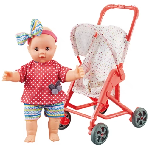 Централният елемент на този комплект е здравата и очарователна бебешка количка с гумени колела за още по истинска реалистичност и с размери 36*53*27 см, идеална за водене на куклата на безброй приключения. Количката е проектирана с удобно столче, което улеснява вашето дете да транспортира куклите си из къщата или навън за разходка. Куклата е с размери 23,5*10*30,5 см, точно точният размер за малки ръчички, които да държат и гушкат. Реалистични черти и меко тяло я правят идеална спътница за грижовната игра на вашето дете.
